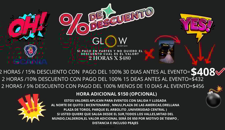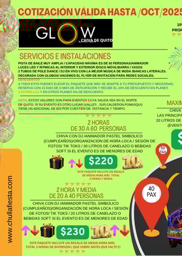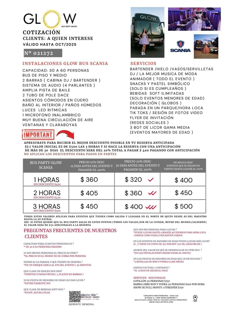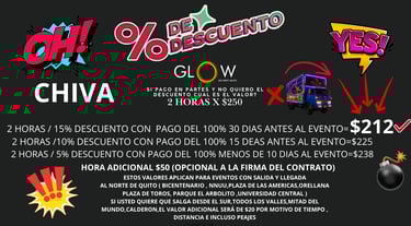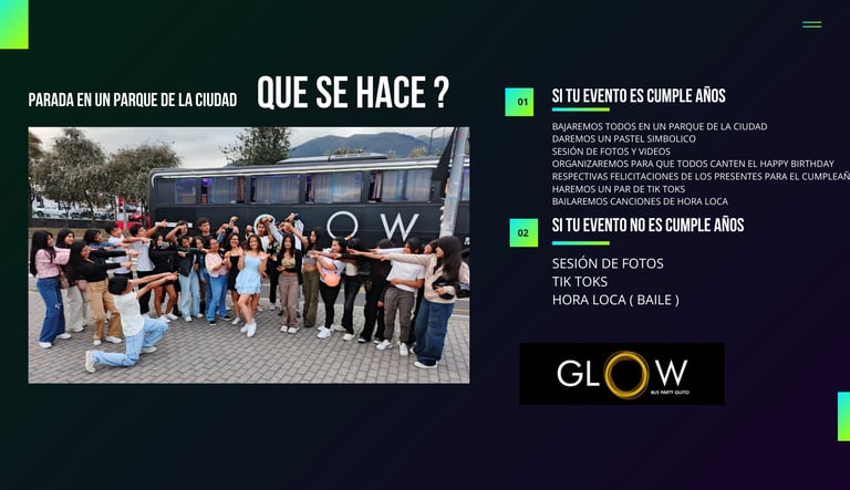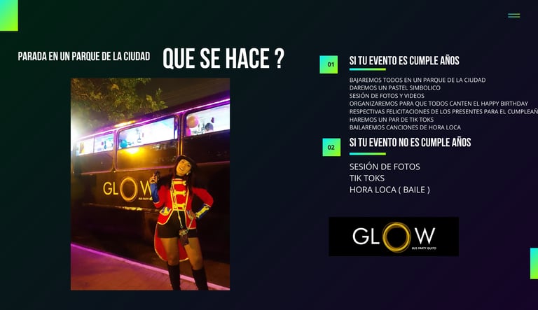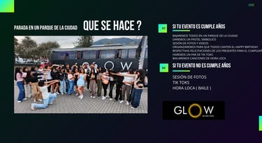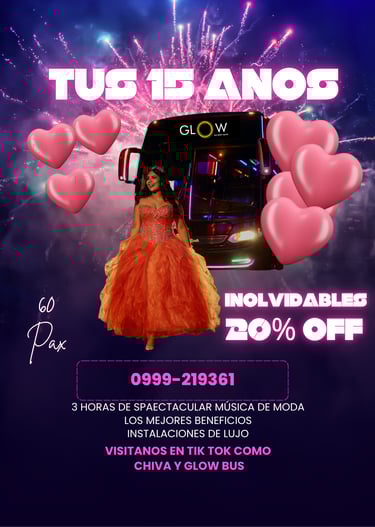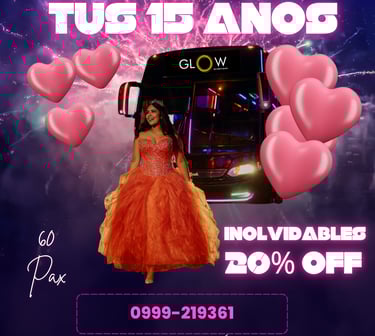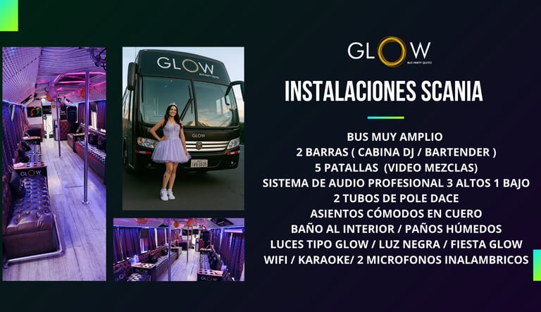 sin lugar a dudas, una experiencia inolvidable. Desde el momento en que ingresaron al BUS Glow , se siente la energía y emoción en el aire. La música contagiosa y mientras el grupo de chicos bailaba y cantaba al unísono, creando un ambiente de alegría y camaradería. Sin duda, la fiesta de 15 años de mi hija fue todo diversión y celebración, les quedo agradecida ya que esta fiesta permanecerá en la memoria de todos los asistentes. ¡Una experiencia para los chicos inolvidable !! RECOMENDADO !!